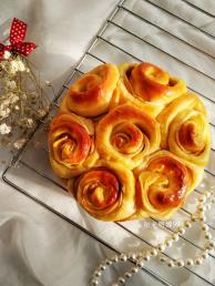 菜名:花朵小面包食材: 高筋面粉 鸡蛋 玉米油 盐 纯牛奶 白糖 酵母粉 苹果片