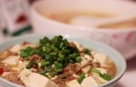 菜名:麻婆豆腐食材: 豆腐 牛肉沫 豆瓣酱 花椒 花椒粉 辣椒粉 胡椒粉 水淀粉 小葱