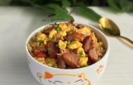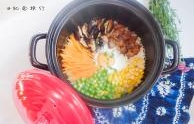 菜名:彩虹煲仔饭食材: 大米 腊肉 鸡蛋 胡萝卜 香菇 青豆、玉米 油 白糖 生抽 老抽 料酒 葱花