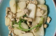菜名:肉末炒年糕片食材: 猪肉 年糕 橄榄油 盐 鲜酱油