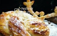 菜名:圣诞花环面包食材: 高筋面粉 牛奶 糖 酵母 黄油 盐 鸡蛋全液 肉松 沙拉酱 松子
