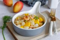 菜名:芒果甜虾山药丁食材: 山药 芒果 北极甜虾 豌豆粒 黑胡椒 海盐 柠檬汁 白糖