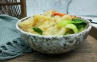 菜名:海鲜疙瘩面食材: 面粉 番薯粉 牛肉 对虾 小青菜 盐 生抽 番薯粉 味精 清水