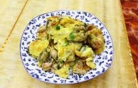 菜名:金牌焗蚝饭食材: 蚝干 生蚝 虾 鹌鹑蛋 香菜、葱 盐、油 蒜盐、酱油、料酒、糖