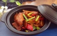 菜名:三汁焖锅食材: 鸡翅中 明虾 胡萝卜 番薯 土豆 彩椒 大蒜 蚝油 甜面酱 番茄酱 酱油 料酒 白糖 盐 黑胡椒