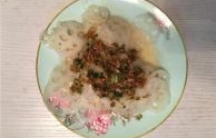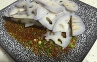 菜名:凉拌藕片食材: 莲藕 橄榄油 辣椒粉 盐 鲜酱油 醋 糖 小葱