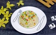 菜名:咖喱虾仁杂蔬饭食材: 虾仁 咖喱 玉米 胡萝卜 口蘑 豌豆 黑胡椒粉