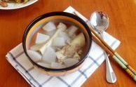 菜名:萝卜丝肉丸汤食材: 白萝卜 猪肉 香菇 蒜 油 盐 料酒 胡椒粉 砂糖 生粉 葱
