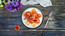 菜名:茄汁柠檬虾食材: 虾 番茄酱 蒜、干辣椒 盐 柠檬片