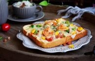 • 食材: 吐司  熟虾仁  火腿  青椒  豌豆  玉米粒   马苏里拉奶酪  番茄沙司  黑胡椒碎