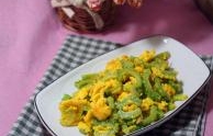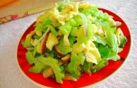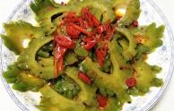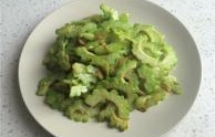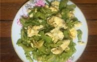 菜名:苦瓜炒鸡蛋食材: 苦瓜 鸡蛋 蒜 盐 鸡精 食用油
