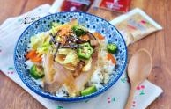 菜名:日式沙拉汁盖饭食材: 猪肉 胡萝卜 包菜 洋葱 秋葵 油 蚝油 蒜 高汤 生抽 盐 淀粉 日式沙拉汁 料酒