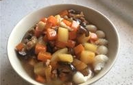 菜名:土豆肉丁猫耳朵食材: 土豆 胡萝卜 香菇 五花肉 猫耳朵 姜 干花椒 干辣椒 老抽 蒜 八角 盐 香叶 桂皮