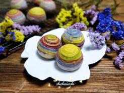 跟一般的蛋黄酥相比,它有色彩艳丽的外表,有螺旋的纹路,可以看