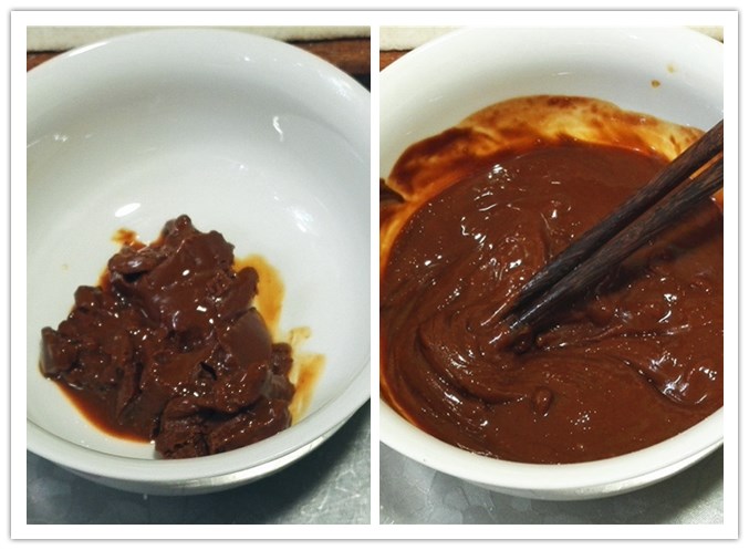 3.将蚝油、盐、白糖放进麻酱里,加水稀释备用。