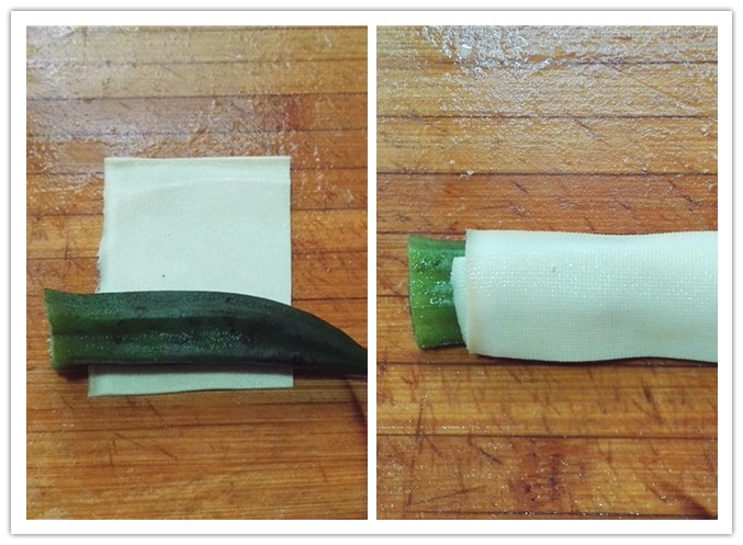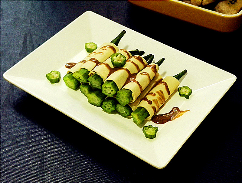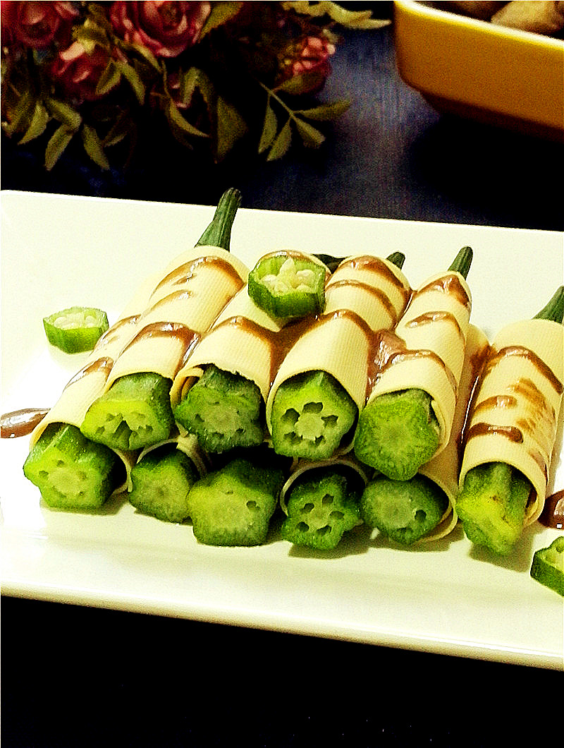 8.卷好的秋葵码入盘子,然后将麻酱浇到秋葵卷上,大功告成,可以开动了。