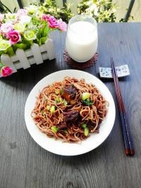 早起一份糖醋排骨炒面,配一杯牛奶。满满的能量和热量哦!