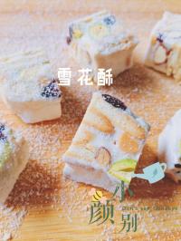 雪花酥,是用牛轧糖混合饼干,坚果以及蔓越莓干制作出来的一种点