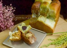 这款吐司用了三种颜色的面团,分别包了三种不同口味的馅料,所以