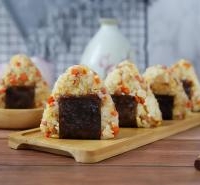 这道藜麦饭团用的是大米、藜麦和玉米渣煮出来的杂粮饭,搭配培根