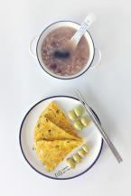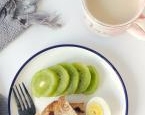 早餐:全麦软欧+猕猴桃+水煮鸡蛋,黄豆+鹰嘴豆打成豆浆