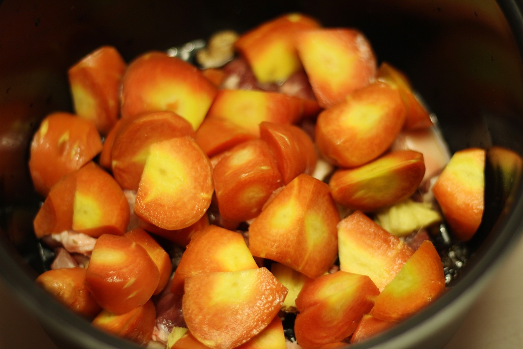 1.五花肉切块,胡萝卜滚刀切块,生姜拍碎,用生抽2勺+料酒2勺+盐1茶匙调成酱汁;