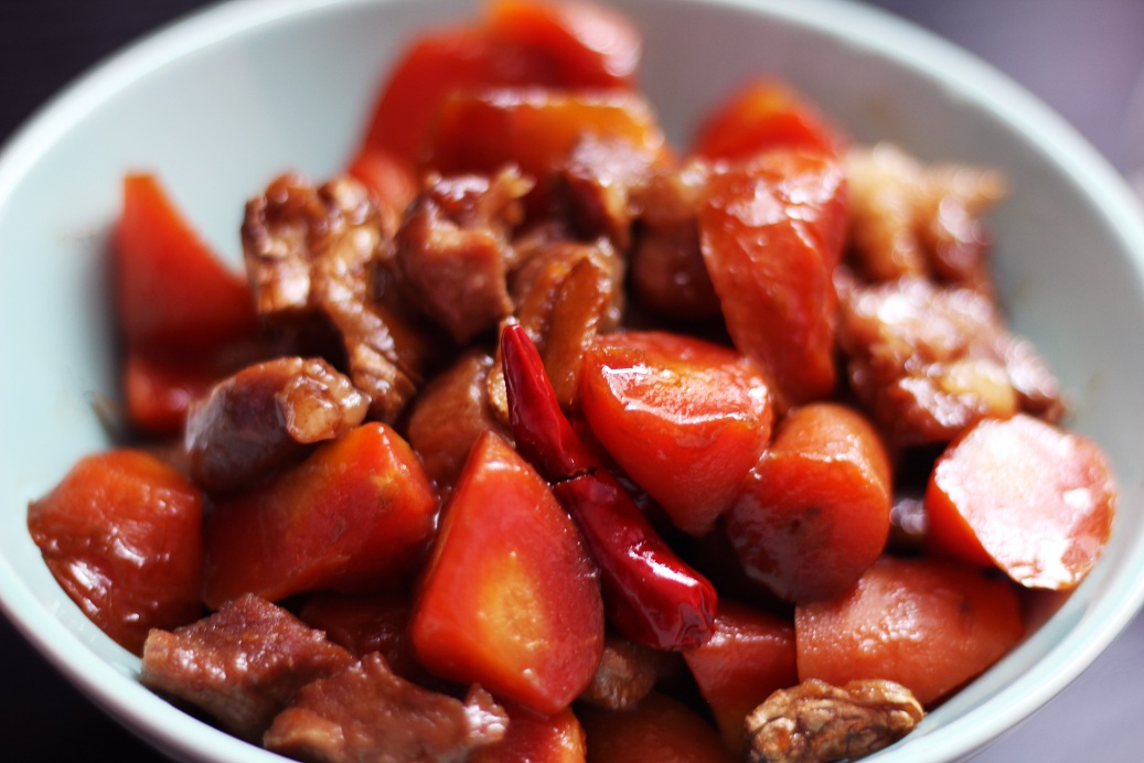 五花肉500g、胡萝卜4根、生姜2块、酱汁(生抽2勺+料酒2勺+盐1茶匙)、冰糖3-5块、干辣椒2个,香油适量