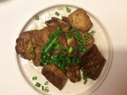 以热油小火微煎,豆腐外皮焦黄酥脆,内里嫩滑松软,配合酱汁烧制