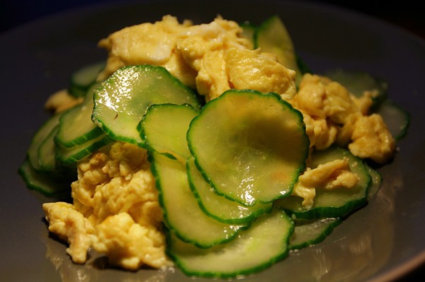 原料:黄瓜1根、鸡蛋2个、食盐、食用油适量