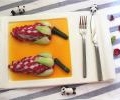 给我一个茄子,三碗米饭都不是事儿!提到下饭的菜,你可能会想到各种重口的荤菜。 其实我们常见的紫色蔬菜——茄子,才是真正的下饭王。 紫皮上富有的维生素E、P是其他素菜所不能比的,不管是烧烤还是红烧,茄子的出勤率总是辣么高。 今儿贺师傅把肉沫和茄子相配,选择简单易学的酱香法制作,别说你只会鱼香茄子! 原料:茄子、肉馅 辅料:小米椒、葱花 调料:烧汁 步骤: 一、斜刀切茄子裹肉馅 首先将茄子、肉馅、小米椒、葱花备好待用 将整茄子从中间切成两半,斜刀切出对多余部分,将肉馅裹进去 注:可以将肉馅加一点生粉 二、油炸茄肉沫 锅内下油,油稍微多一点,热至7成油温,用大火炸至茄子略缩水 用筷子插一下尾部,能插动就可以起锅 Q:为什么要油炸? A:这样可以去除茄子内部的水分,让它更加入味 三、炒制汤料淋茄装盘 锅里留底油,加入烧汁、小米椒 然后勾薄芡,再将其淋上茄子即可 Q:勾薄芡和勾厚芡有什么区别? A:薄芡就是勾芡粉的时候,水加多一些。相反,水加少一些就是厚芡。 您还有什么疑惑亟待我们为您解答呢? 请在评论区留下您的珍贵建议吧~! 还有机会获得厨师的专业解答喔~!