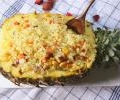 炒饭这么炒,好吃不油腻!你一般会在什么时候做炒饭? 一个人不愿炒菜嫌麻烦的时候,或者不太想出门的时候吧。可是炒饭通常都很油腻,这样容易长胖也给吃货带来了淡淡有忧伤......别怕,味游君今天请来了张师傅帮忙解决这个难题。 喏,就是这不油腻高颜值的菠萝炒饭。外面买高价,不如自己做划算!而且美美的颜值看着心情都很好。 并不复杂,只需要一点洋葱、胡萝卜、玉米、香蕉就行。喜欢重口味的,可以加点辣椒酱或者麻辣酱之类的,废话不多说,只需2步的炒饭Go! 主料:米饭 配料:菠萝、胡萝卜、玉米、洋葱、香蕉、鸡蛋 调料:盐 步骤: 一、切菠萝掏空做容器 将新鲜菠萝、香蕉、胡萝卜、玉米、洋葱备好 将新鲜菠萝洗净后,横着切除三分之一 用小刀将其肉挖出掏空,保留菠萝肉,壳做容器 注:表皮最好切平整,这样盛饭比较容易,外观也好看 将洋葱、胡萝卜洗净切丁 二、炒料加蛋调味入菠萝 锅里入油,油温6成熟时,加入切好的洋葱、胡萝卜、玉米、香蕉 大火爆炒约30秒左右,加入米饭 注:爆炒的时间不宜过长,否则会丢失原本的香嫩 小贴士:根据个人喜欢,加一个或两个蛋都可 均匀翻炒后,加入鸡蛋,炒出蛋花 加入盐在均匀翻炒即可出锅,把炒好的饭和新鲜的菠萝丁装入菠萝内即可 注:香米应蒸得稍干一些,这样制成的炒饭才好吃