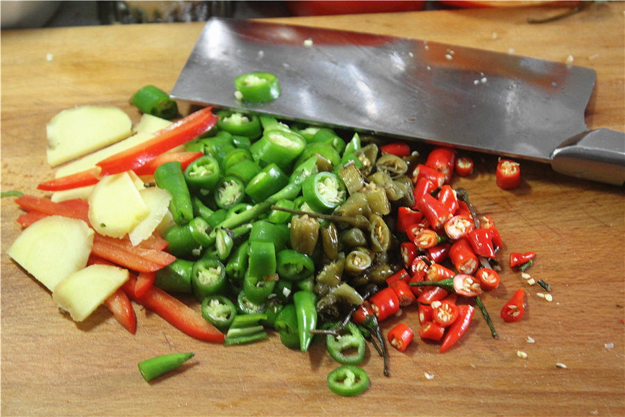 首先将姜、蒜、葱、小米椒、红椒、青椒、野山椒切好备用