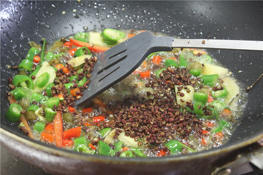 油温烧至三成时,把刚切好的辅料入锅并撒上干青花椒一起
