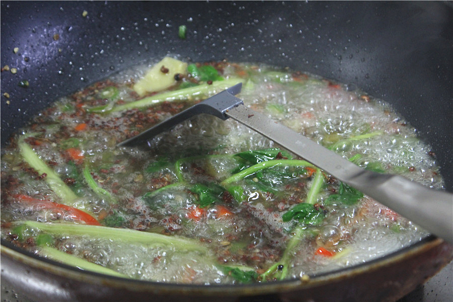随后入高汤,加辣鲜露、鸡汁、蚝油、美极鲜、鸡精、味精调味,并将洗好的芹菜入锅一起煮熟