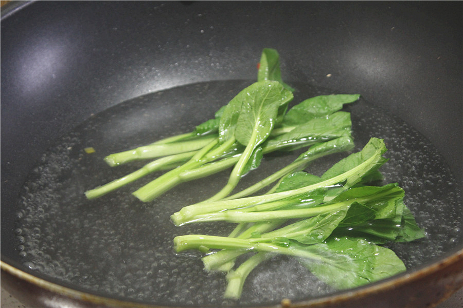 先将洗净的芥兰入锅煮熟,再捞出待用