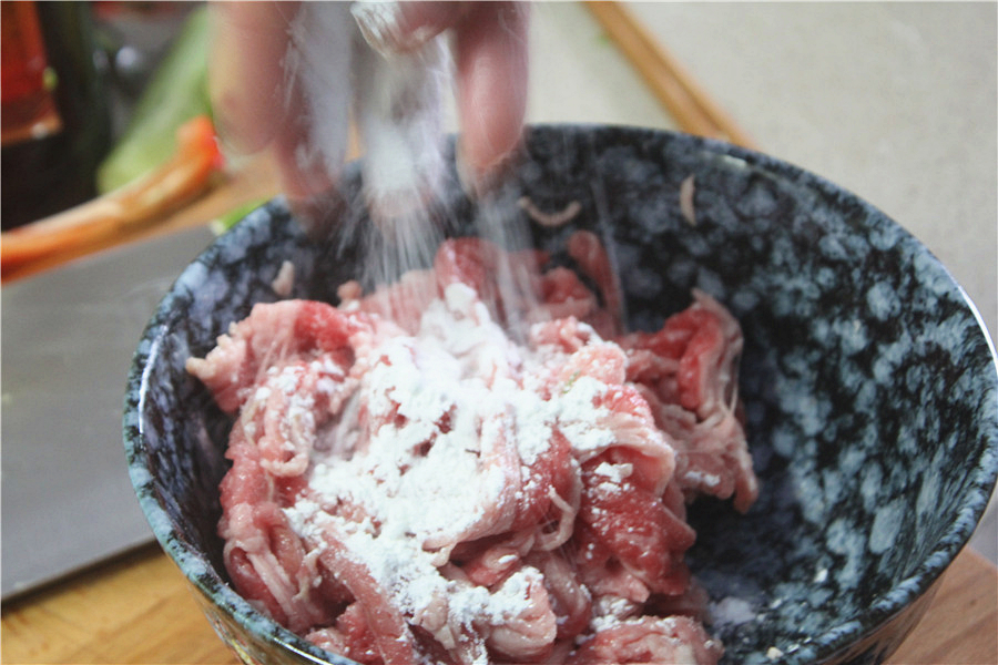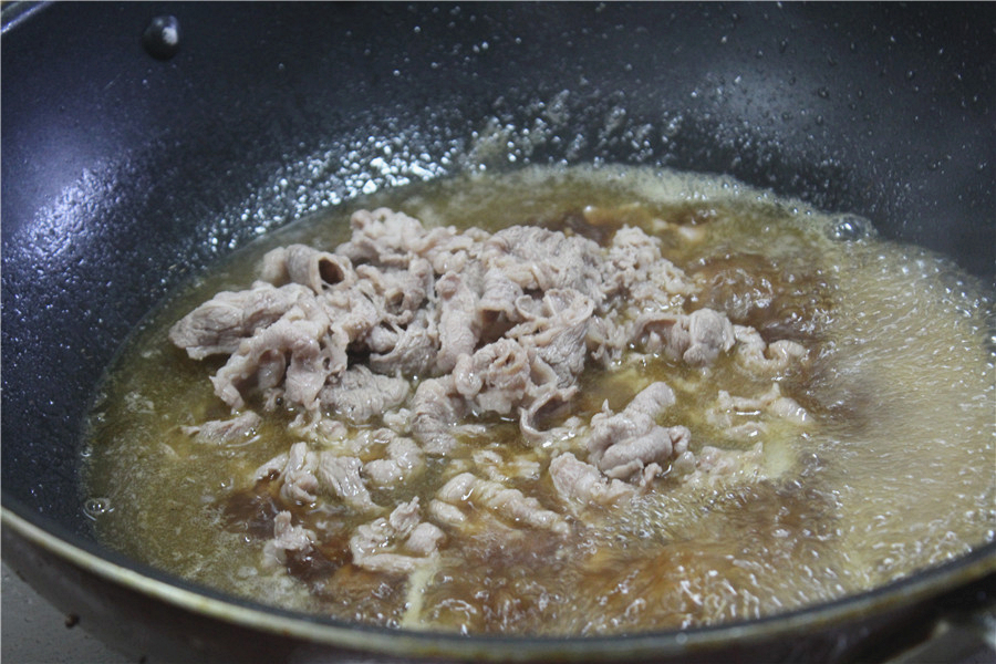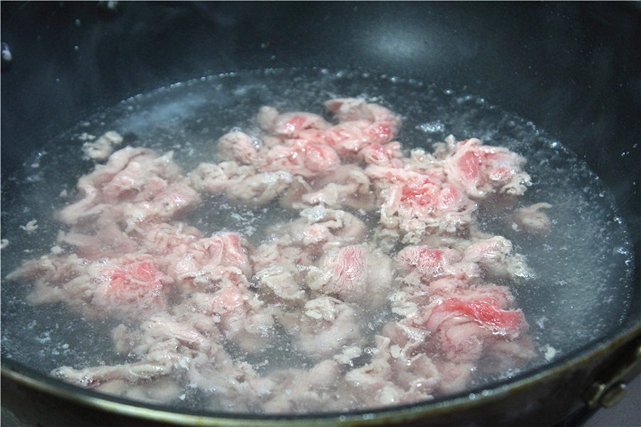 将肥牛卷勾芡,锅内烧水,肥牛入锅焯一下,捞出
