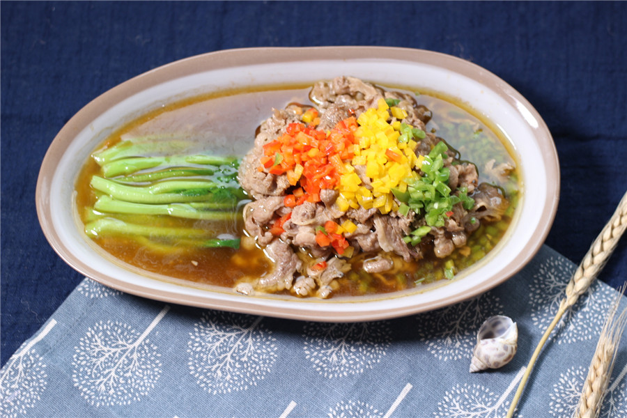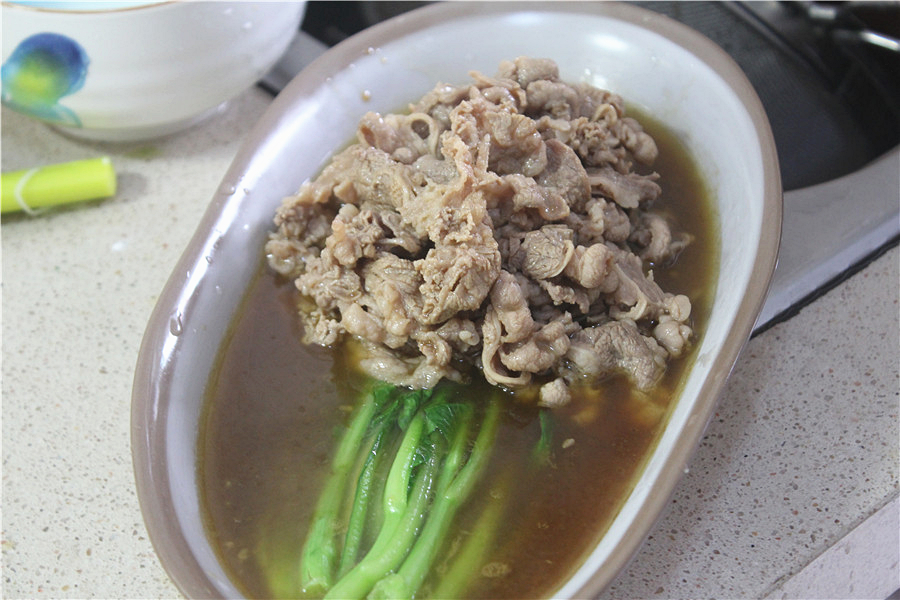 将煮好的芥兰放置盘内,肥牛放入芥兰上,倒入汁水