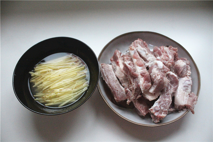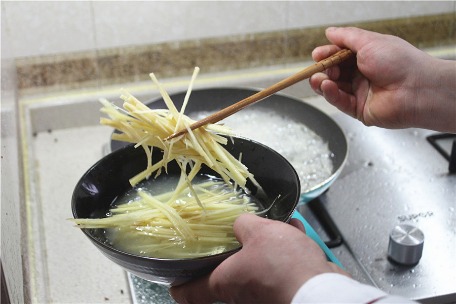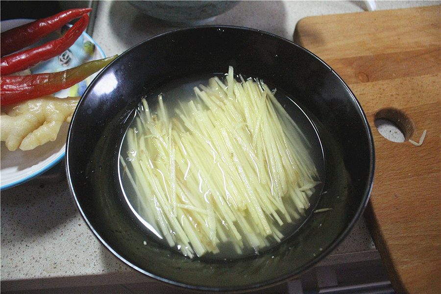 将洗好的姜,切成大小均匀的丝,然后装入盛有水的碗里