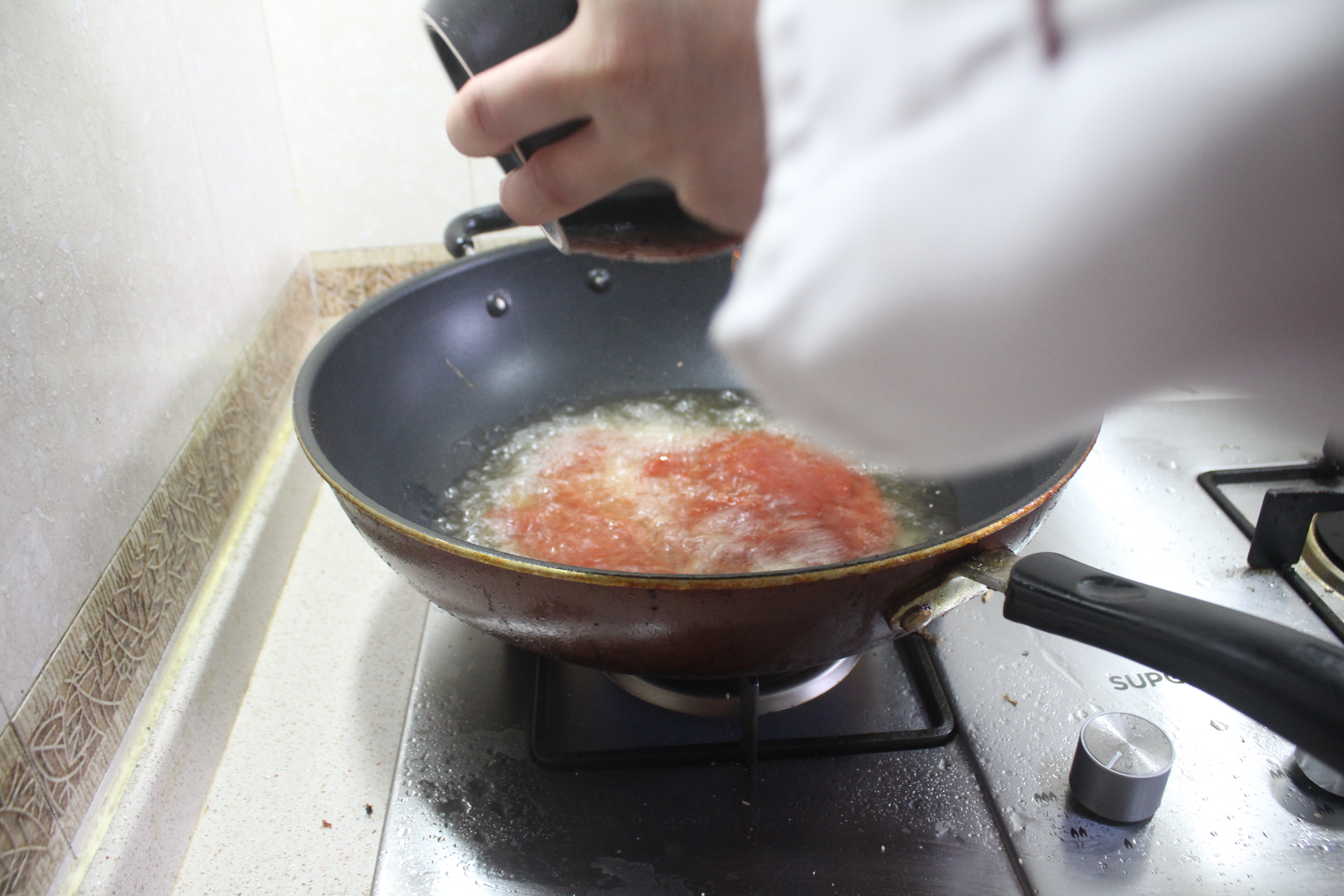 接着锅里入油,用番茄酱、白糖调制成酱,干炒3-5分钟