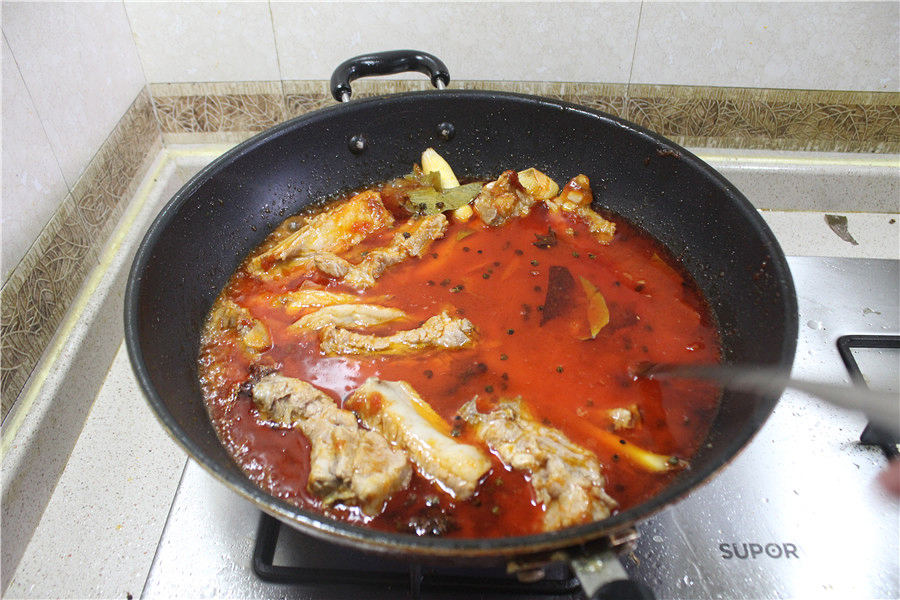 然后加入八角、三奈、草果、陈皮、姜、大葱、花椒、味精、鸡精,干炒3-5分钟