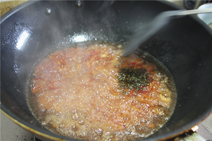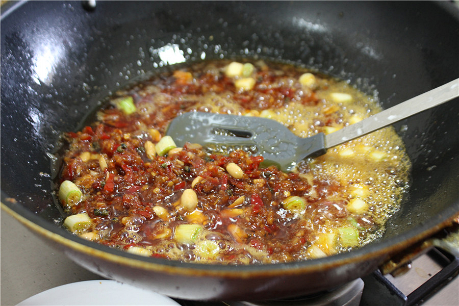 锅里入油,加入姜片、蒜、放豆瓣、泡椒炒香
