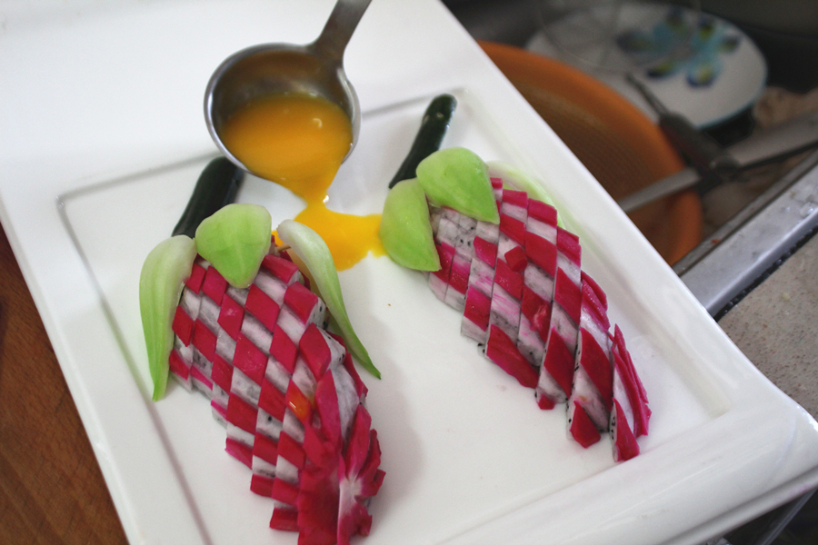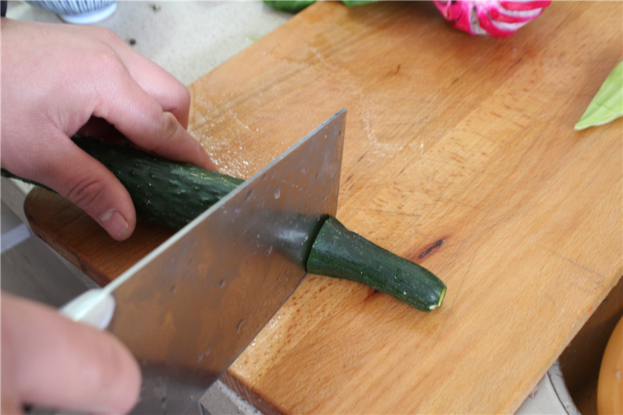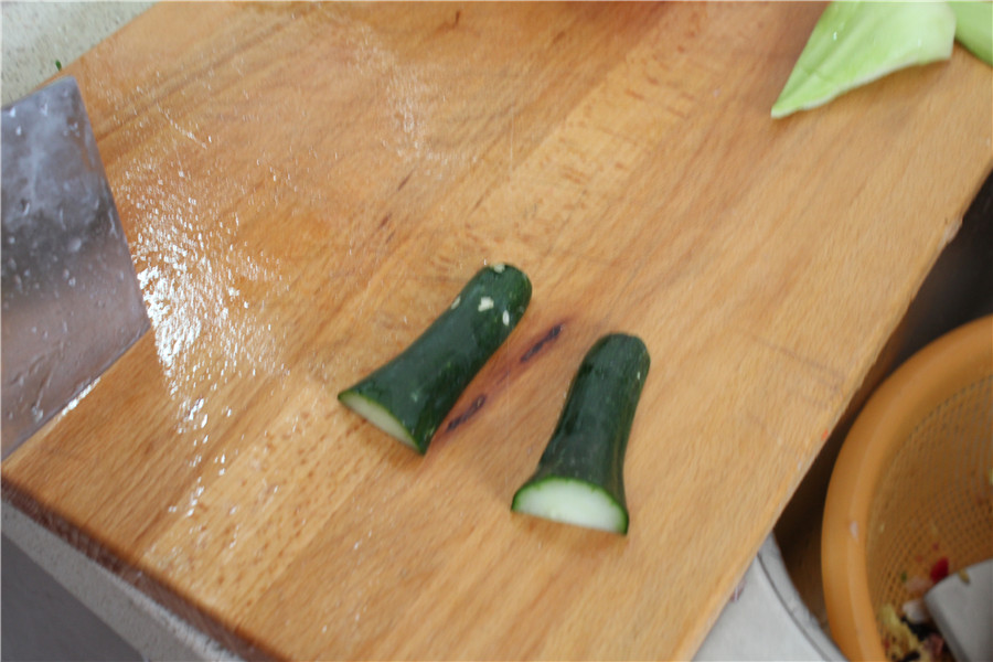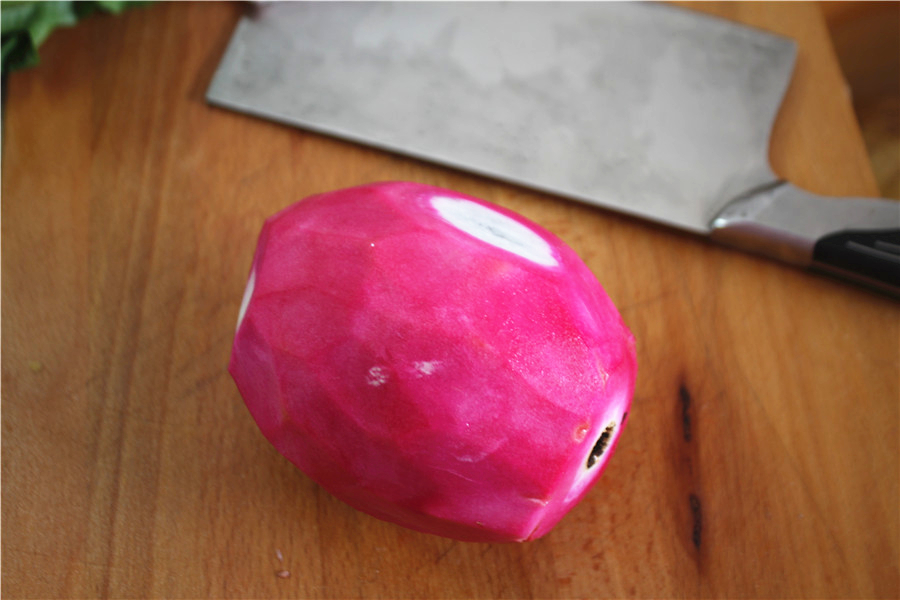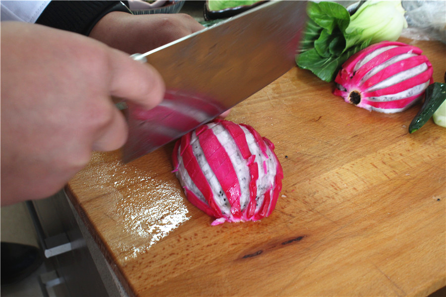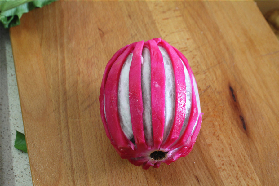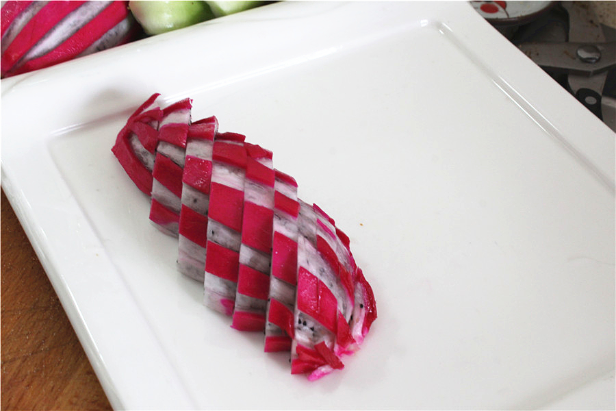 接着改花刀,将红色的皮切细条,隔一条留一条