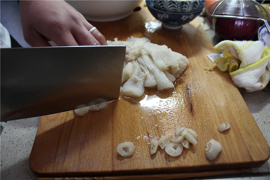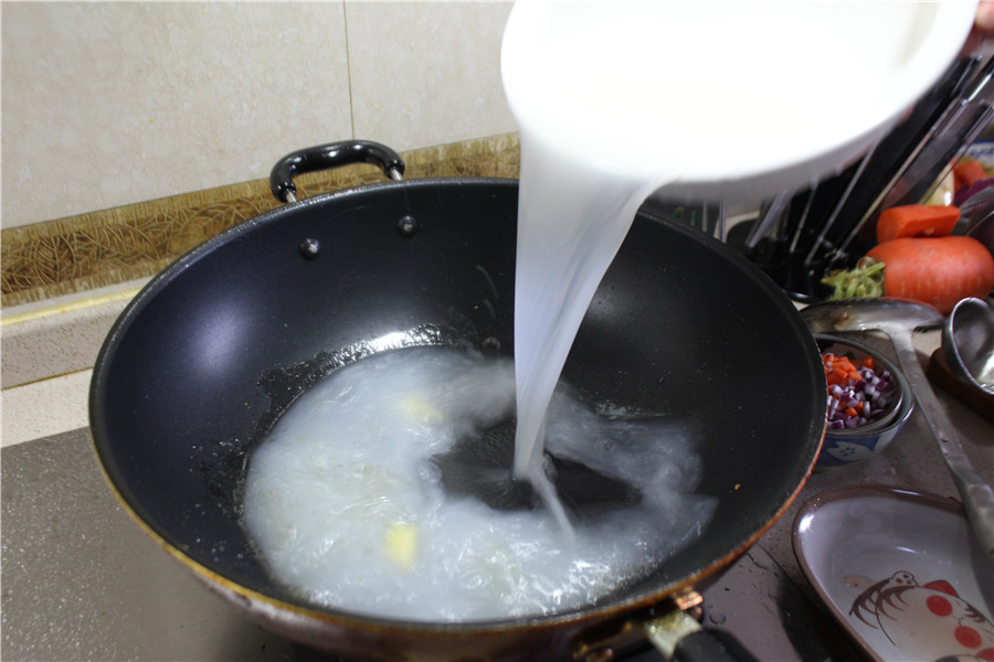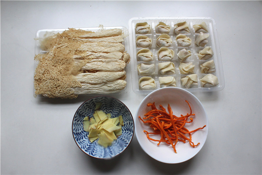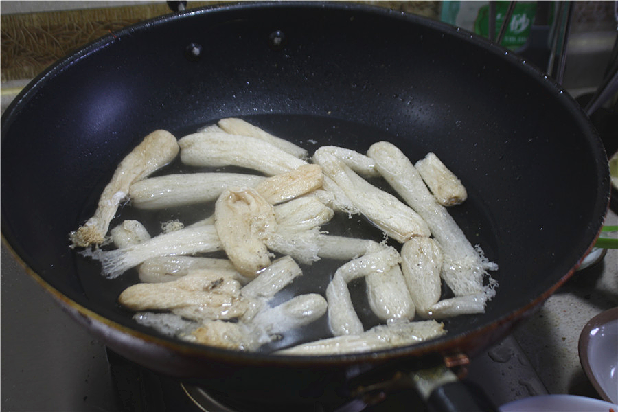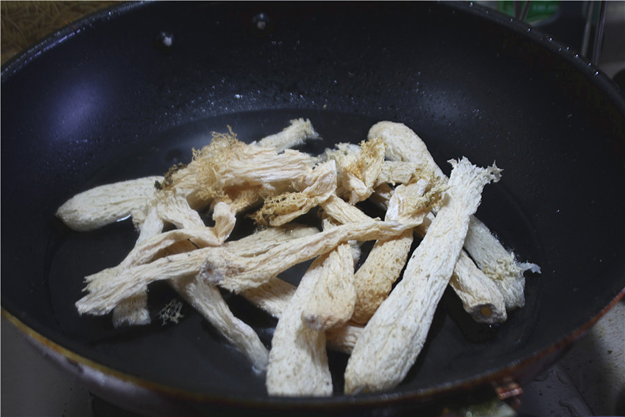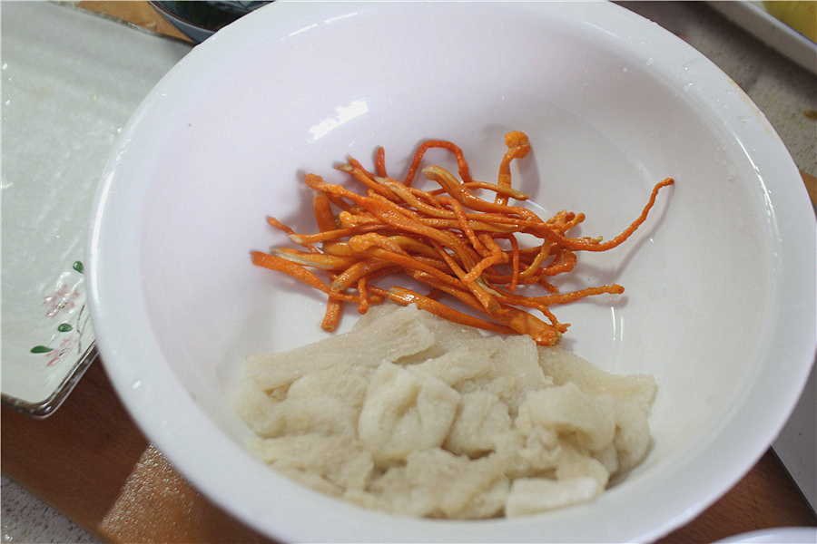 放入虫草花、竹荪,盐调味,煮好后倒入碗里备用