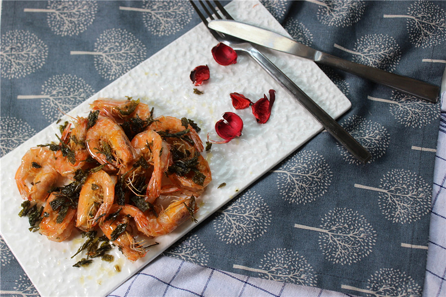 准备好鲜虾和茶