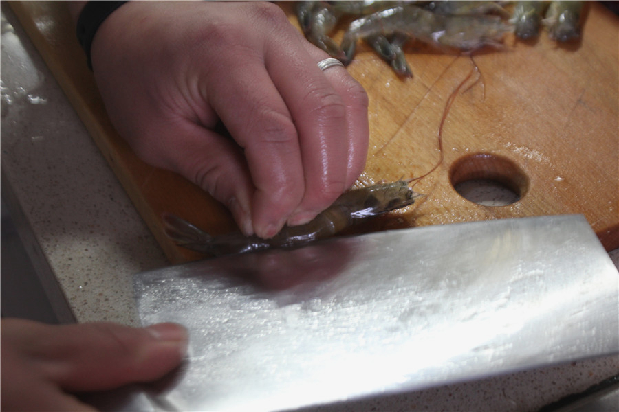 用刀对刨虾身,去掉虾线,再冲洗一下
