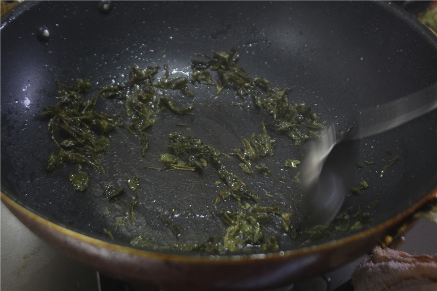 锅内放油,下入茶叶翻炒