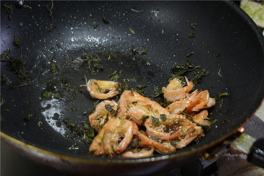 加入虾一起翻炒,加盐翻炒均匀起锅