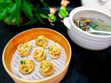一锅出--玫瑰花蒸饺+蟹味菇蚬子汤