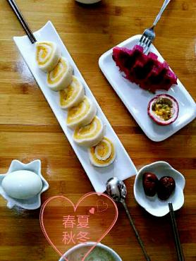 米粉糊铺在抹油的平盘上,微波炉转熟,抹上红薯泥,卷起切开,一款快手早餐就完成了002017-12-16 06:29