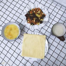 今日小学生早餐:南瓜小米粥,小米煎饼,胡萝卜木耳炒鸡蛋,香蕉奶昔。002017-12-01 08:17